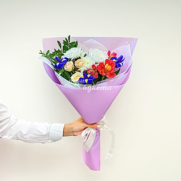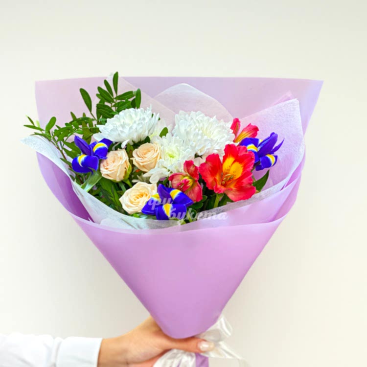 Мини-букет ирисов, хризантем и роз